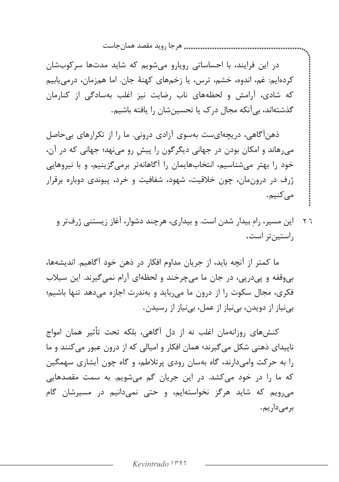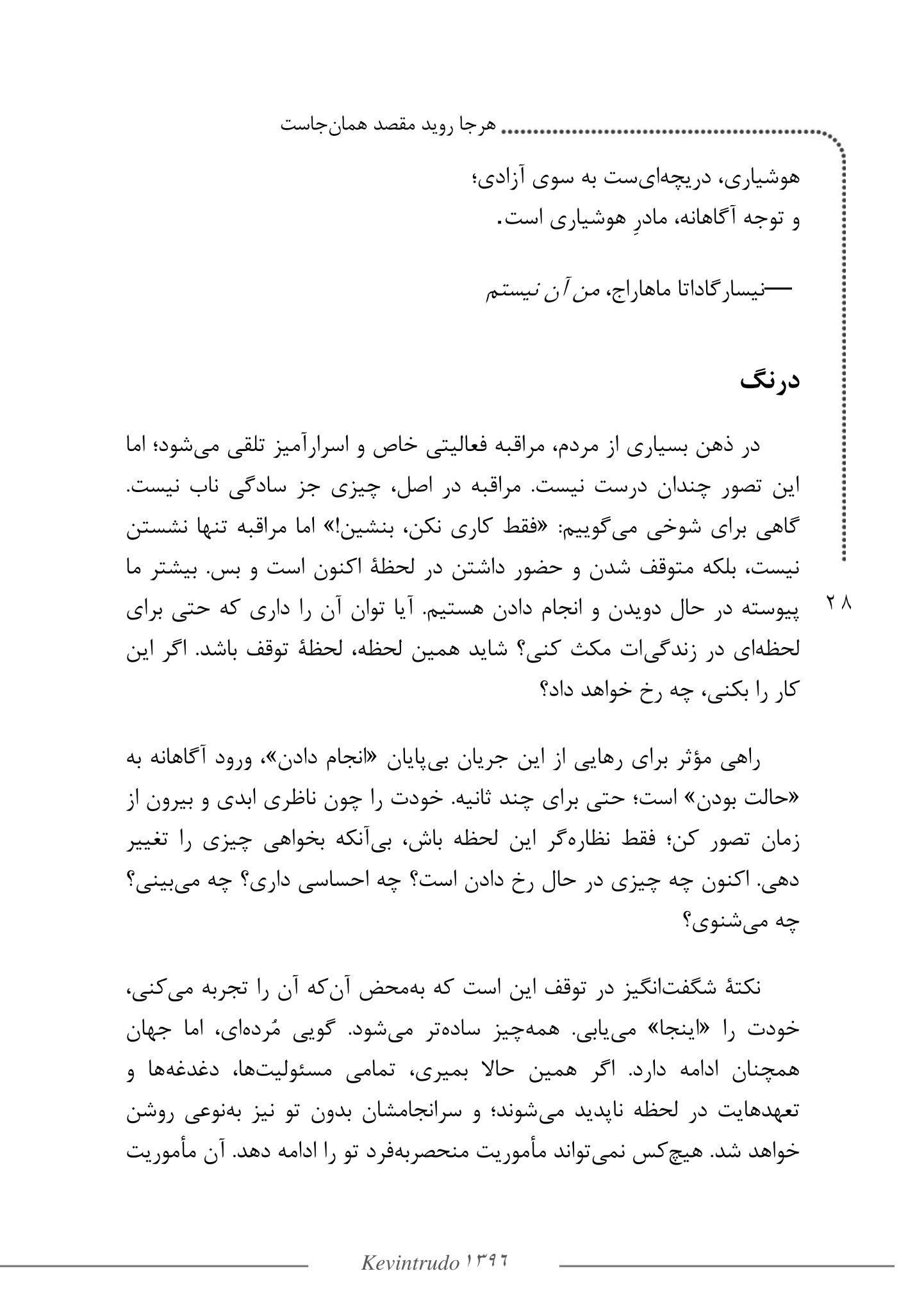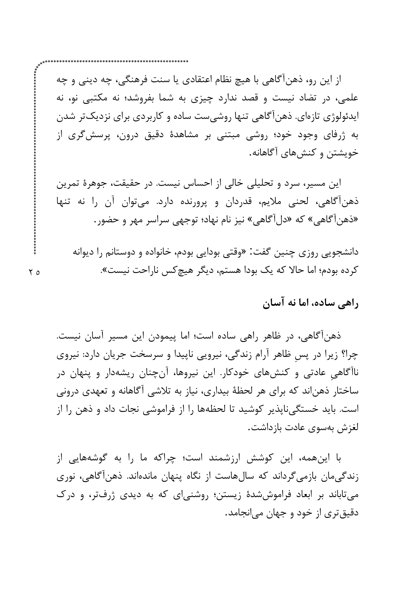 یکی از نکات ارزشمند کتاب این است که ذهنآگاهی را از حالت «مفهومهای سنگین» بیرون میآورد و آن را به یک تجربهی ملموس تبدیل میکند.