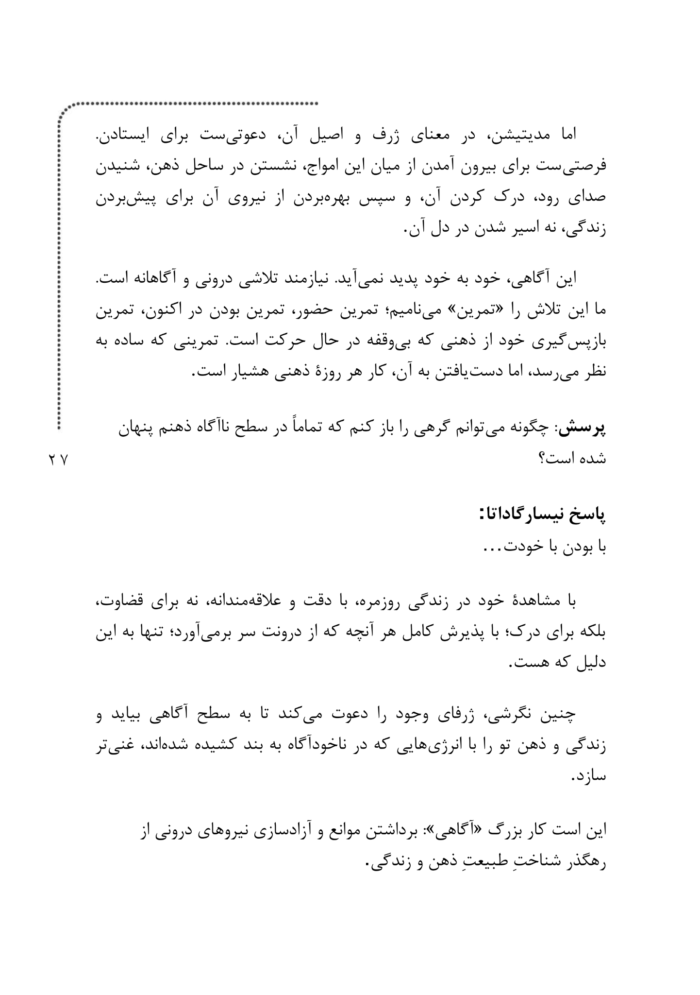 همین نگاه ساده و بیپیرایه باعث شده این کتاب برای تمام افراد ــ چه مبتدی و چه آشنا با مراقبه ــ قابل استفاده و اثرگذار باشد.