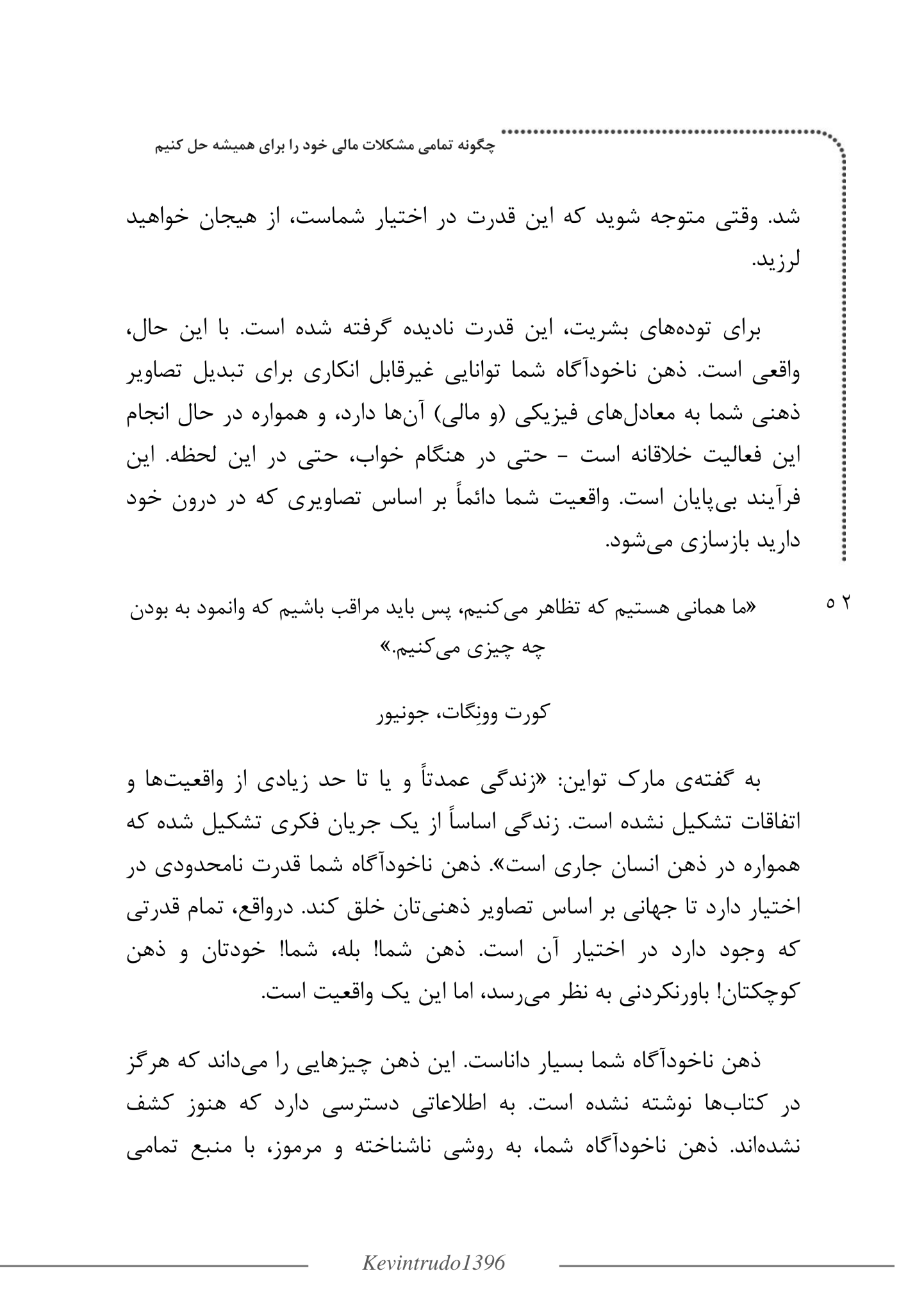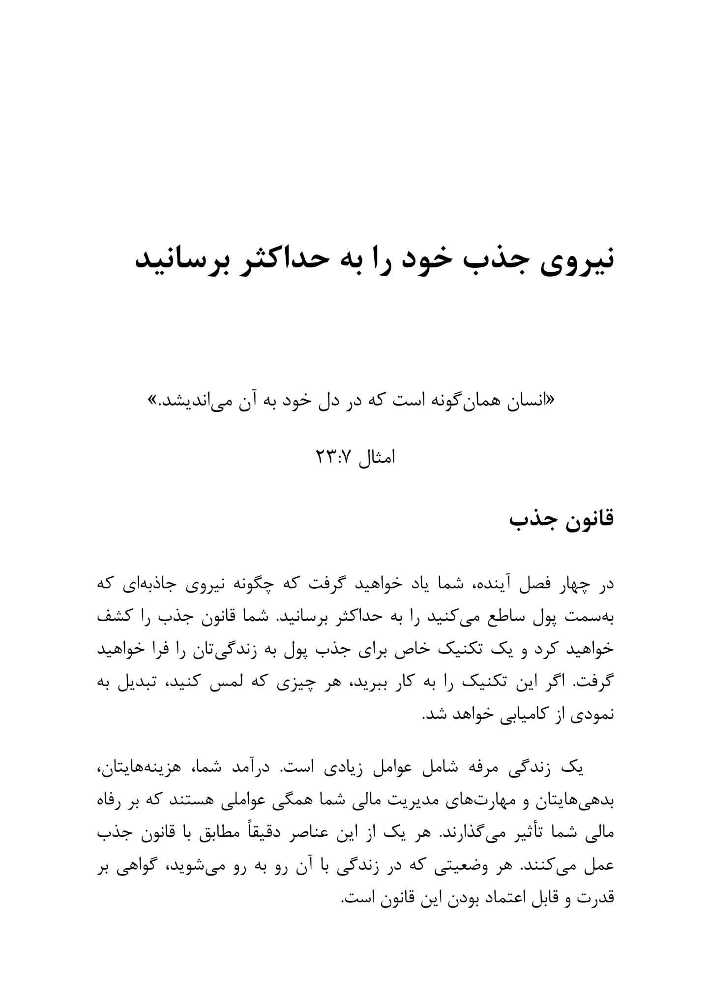 مطالعه این کتاب برای افرادی که احساس میکنند در چرخه تکراری مشکلات مالی گرفتار شدهاند، بسیار مفید است. مفاهیم ارائهشده در اثر به شما میآموزند چگونه باورهای محدودکننده را کنار گذاشته و با تمرکز بر فراوانی، جریان ثروت را به زندگی خود جذب کنید. نسخههای مختلف این کتاب از طریق نشر کوانتوم در دسترس است و میتواند گامی مؤثر برای رسیدن به آزادی مالی و آرامش ذهنی باشد.