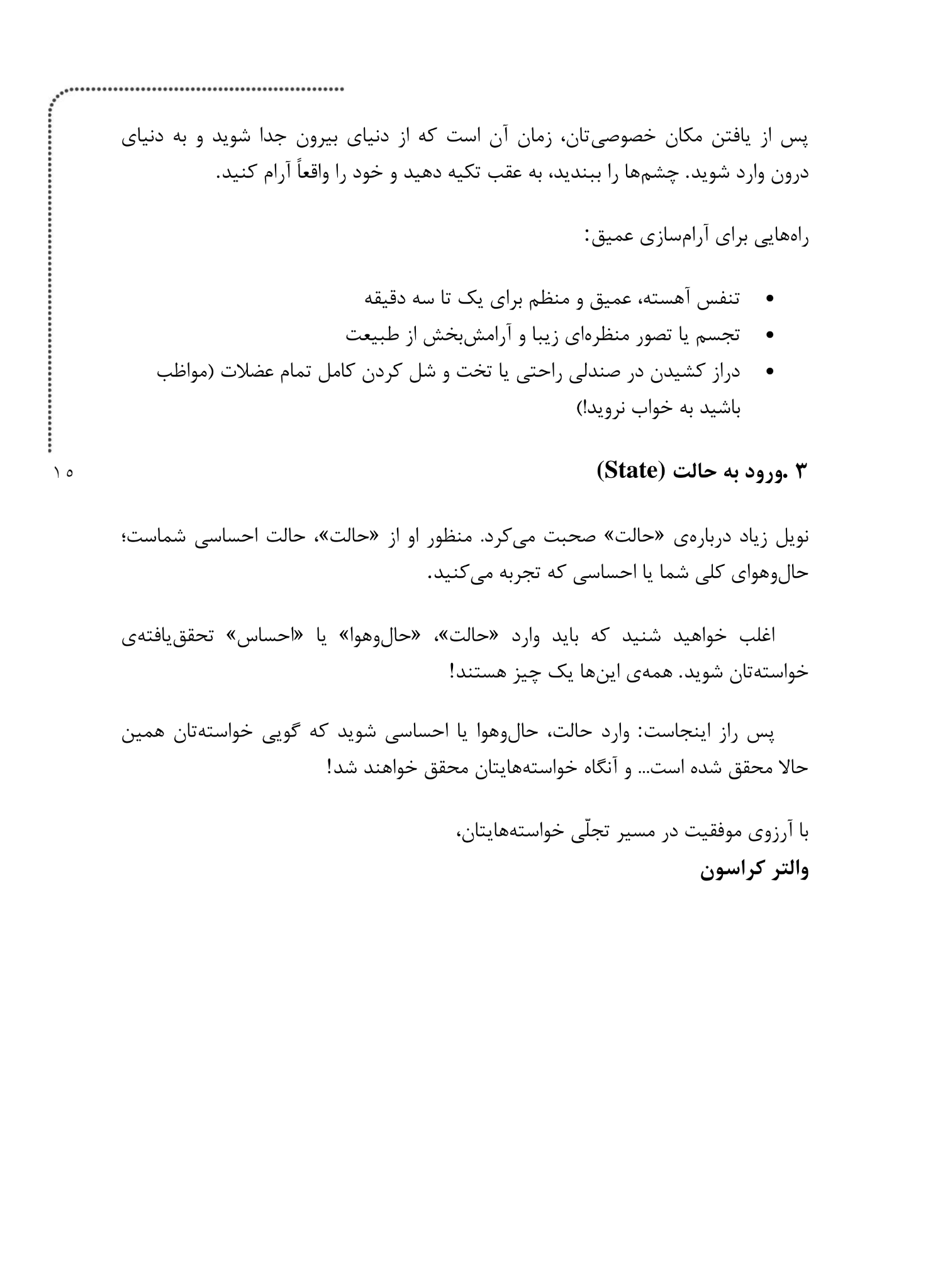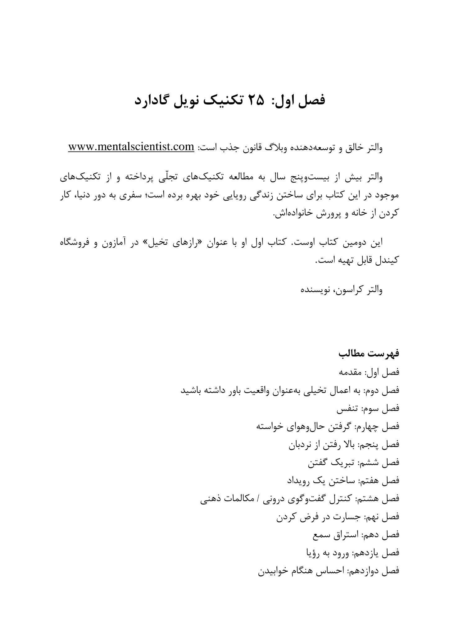 در این اثر، نویسنده اصول تفکر خلاق و تجسم ذهنی را توضیح میدهد و به خواننده نشان میدهد چگونه میتوان با تمرکز بر خواستهها، زندگی خود را به شکل دلخواه شکل داد. کتاب گنج نامه مرجعی کامل برای درک قانون جذب و کاربرد عملی آن است.